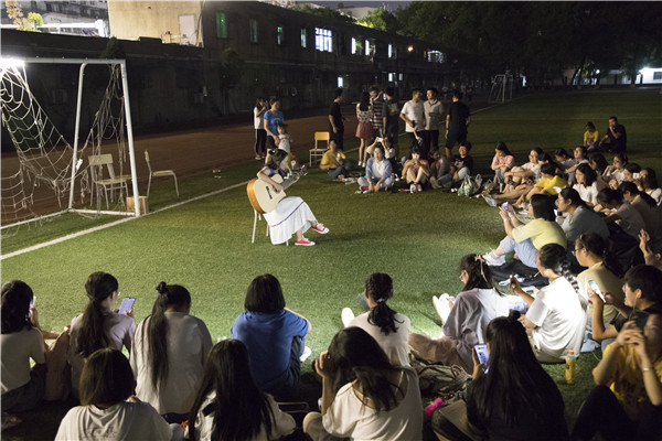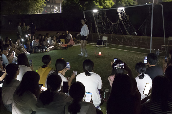 悦耳的音乐声传来,《东西》、《云烟成雨》、《往后余生》等流行歌曲的演唱引得观众一起跟着演唱者轻声地合唱。汉语言文学2018(2)班的程晟斕表示:“选择《云烟成雨》这首歌,是因为这首歌的旋律很动听,歌词也很优美,希望可以引起大家的共鸣。”随后,一首合唱《改革春风吹满地》更是令同学们捧腹大笑,大家集体跟随歌曲的节拍有节奏的挥动着手机的闪光灯。汉语言文学2019(2)班的翟雯昕笑着说:“在选定节目之初我们觉得大家准备的节目都很正式,所以想用一个相对轻松搞笑的节目来活跃一下气氛。”