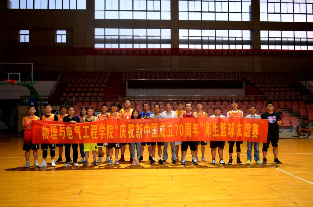 9月26日,为了在全院师生中弘扬爱国主义精神,深化社会主义核心价值观建设,从健康教育方面引导学生以昂扬的精神面貌向新中国70华诞献礼,物理与电气工程学院举办师生篮球友谊赛。比赛在院教师代表队与学生篮球队之间展开。