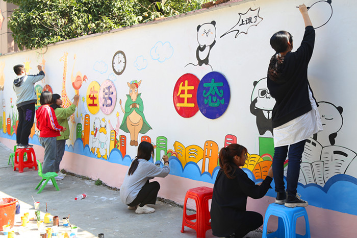 “学习”中的大熊猫、披着绿风衣学者模样的马、乘坐着气球飞行的小黄鸭……“虽然是简单的两面墙,但我们用了四天的时间设计构思墙绘的主题内容。”环境设计专业2018级的农承忙说,“我们希望每一个图案都充满童趣,更符合小朋友的视角和心理,帮助丰富他们的童年世界。”(文/学生记者 韦明慧 图/学生记者 胡蝶)