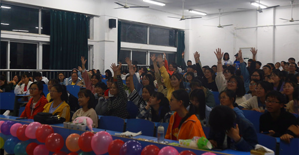 来自化学师范专业2019(3)班的王雪峰早早地就到了教室。他说:“我在PU上看到这个活动,很感兴趣,就报了名。知道会有很多人,所以特意早点到。”在知识竞答环节,他抢到了答题机会并答对了题目,“讲座前,关于淡水豚我知道的很少,我觉得这个讲座可以开拓我们的视野。”