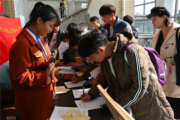 活动伊始,食堂门口醒目的横幅海报和高高摞起的信件吸引了不少来往学生驻足观看。“这边报名签到即可领取信封信纸,我们会在2020年的六一儿童节将信作为礼物由我们团队成员送到指定的收件人手中,同时大家可以捐赠两元作志愿经费为留守儿童献爱心,希望大家踊跃参与啊。”环境工程专业2019(2)班的汪训祖向同学们介绍道。