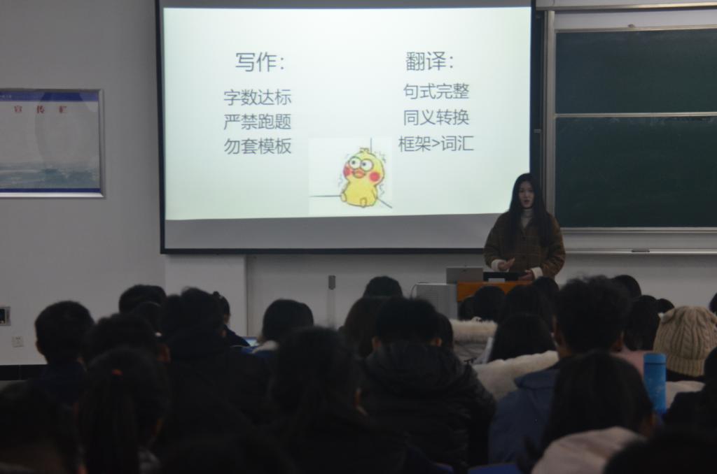 报告会上,汪心琪分享了四六级备考、英语学习、课外活动以及未来规划的相关知识和经验。尽管已经参加过很多大型比赛,她仍然谦虚地说自己的经验并不是很足,这是她第一次做长时段的演讲,还是有些紧张。她强调要认清形势,放弃幻想。因为考试总会保持相对稳定的及格人数,总会有部分人失败,所以只有自己足够优秀才不会被淘汰。在分享参与课外活动的经验时,她鼓励同学不要害怕,勇敢尝试,“You will never know until you try it.”她说:“你不去尝试就不会发现自己的特长与潜质,课外活动能帮助我们找到这些优势,一定要多多参与。”她表示自己已经大四了,最想和大家分享的经验其实是做未来规划。“做好未来规划很重要,不要等待别人告诉你应该怎么做,自己去寻找的经验远比别人分享的有用。”她建议同学们要提前了解专业对口工作,根据兴趣确定方向,有计划地提前安排寒暑假实习活动,在平时的学习中,注重能力培养和经验积累。