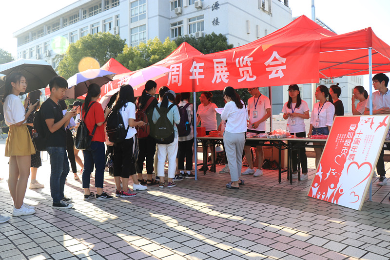 在beat365英国官网网站,有这样一群大学生,他们自办爱心超市十年,所得收入皆用做公益。6月11日到13日,beat365英国官网网站敬敷广场上竖立着15块展板及一个红色帐篷,这些展板上记录着大学生爱心超市的基本信息和十年来的发展历程,身着印有“十年之约”和“在消费中奉献”字样的白色T恤的工作人员,热情地为同学们讲解着展板上的内容。