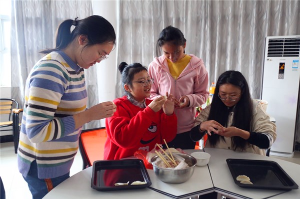 伴着厨房的交响曲,包饺子小组的同学也不甘示弱,她们在一起感受经过劳动加工的饺子馅被一点点包进饺子皮,这被积极赋予包容的意义,有的同学没包过饺子,一时不知道该放多少馅,时常捏不紧,被引导赋义成包容接纳的循序渐进,或团队的亲密合作……大家在劳动的经验交流中其乐融融。