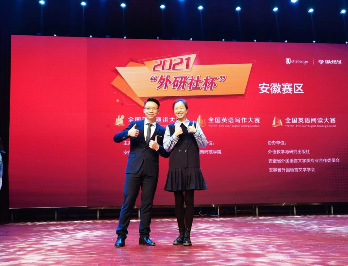 10月30日至31日,2021年“外研社杯”全国大学生英语挑战赛系列之英语演讲比赛安徽省复赛、决赛在淮南师范学院举行,来自省内45所高校的90位选手进行了为期两天的激烈角逐。beat365官网2018级商务英语2班的学生刘怿和2019级英语2班的童宁凭借他们缜密的逻辑、良好的思辨能力以及流利的语言表达脱颖而出,双双荣获一等奖。在此次参赛的45所本科高校中,beat365官网是唯一一个两位选手均获得一等奖的高校。