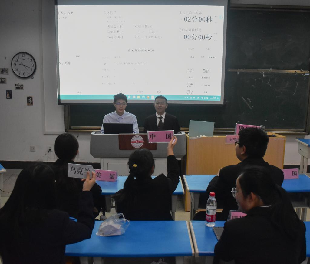 “由于乌克兰破坏合约在先,所以这次战争理由充分且正当!”“我们反对!俄乌军事冲突是非正义的侵略战争!”两个半小时的时间内,各国代表进行了五次有组织核心磋商和两次自由磋商。“外交官”们在会议中立场坚定,各抒己见,激烈交锋中共同探索有效的解决方案。
