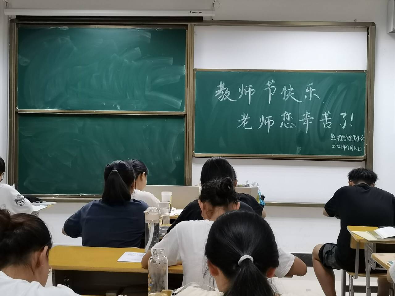 9月10日上午,走近数理学院,“一支粉笔写春秋,心中有数、言之有理。”等字样在学院门前电子显示屏上间歇播出,“教师节快乐,老师您辛苦了!”教室里也传来声声祝福,原来是该院学生在教师节向老师送出祝福。