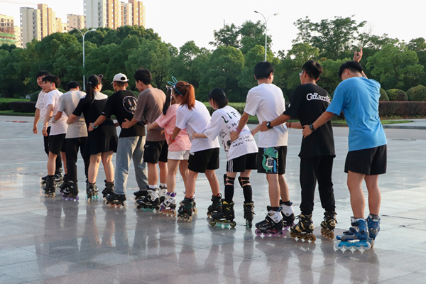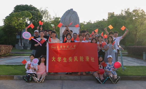 从行政楼到东门操场最后来到润博餐厅,轮滑队的每个人携带一面国旗一面党旗,环绕校园进行滑行,沿途还会给路过的学生们赠送气球、小旗子等小礼品。独特的活动形式吸引了不少学生的关注,不断有学生送来掌声、欢呼声。思想政治专业2019级(2)班季婕也被现场的气氛所感染,立马从休息处穿起轮滑鞋加入到了滑行的行列。她表示,“相比于课堂上党史知识学习,在轮滑的过程中传递红色精神的形式,能让我有更多的参与感。”