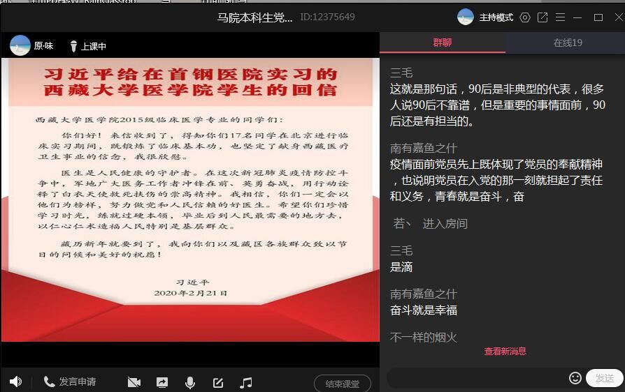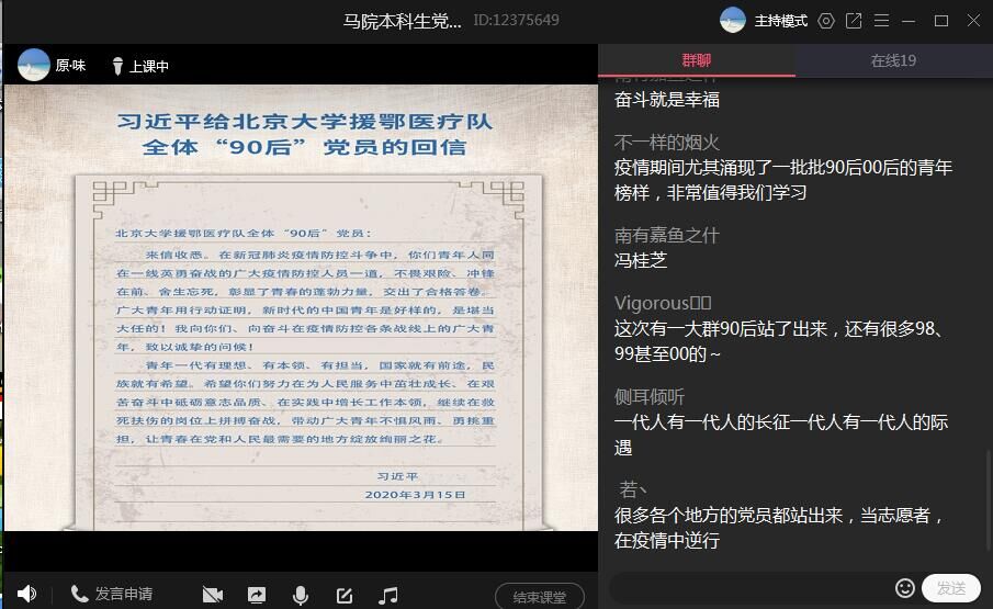 经过对回信原文的学习和热烈的讨论,一方面加强了学生党员对自身权利、义务和责任的认识,另一方面,联系疫情防控实际,全体党员对党的初心和使命有了更为深刻的领悟。在最后重温入党誓词的环节中,每一个人更是坚定了成为有理想、有本领、有担当的“90后党员”的决心。(沈沫)