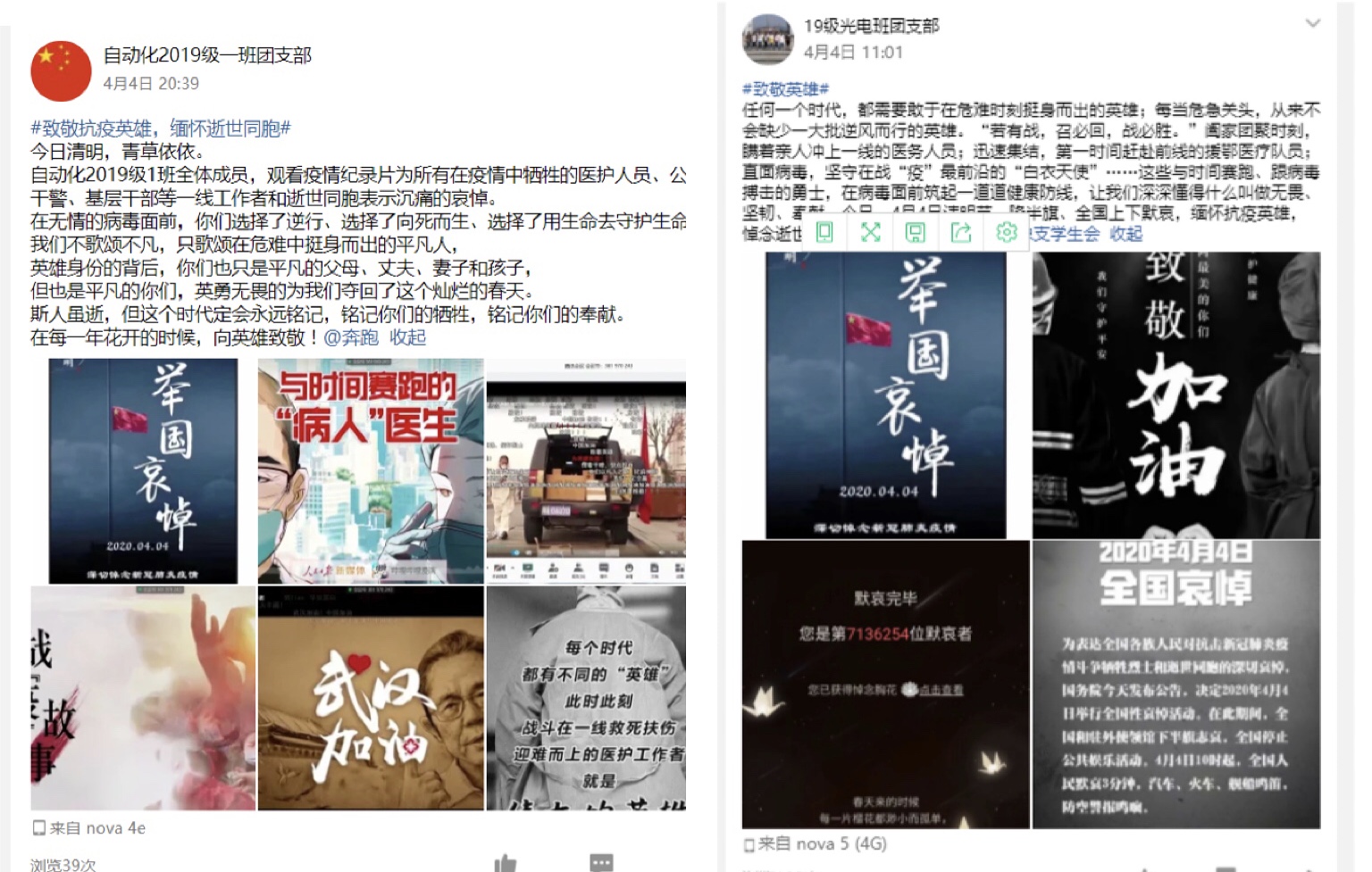 4月4日上午十时,伴随着防空警报的鸣响,电智学院广大团员青年在所在地为牺牲的烈士和同胞默哀3分钟,向英雄致敬,向逝者致哀。清明节期间,广大团员青年们自学了习近平总书记在湖北省考察新冠肺炎疫情防控工作时的讲话。同学们还通过登录中华英烈网“清明祭英烈”专栏,参与网上祭扫英烈活动,学习革命先烈的英勇事迹和伟大精神,学习新冠肺炎疫情防控牺牲烈士用生命守护生命、用生命践行使命、用生命书写担当的崇高精神。