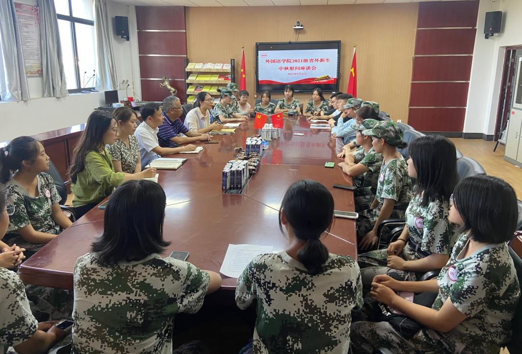 下午,外国语学院召开2021级省外新生中秋慰问座谈会,学院领导班子、新生辅导员老师以及来自云南、甘肃、山东、湖北、四川、山西、江苏的20余名研究生、本科生参加了座谈会。