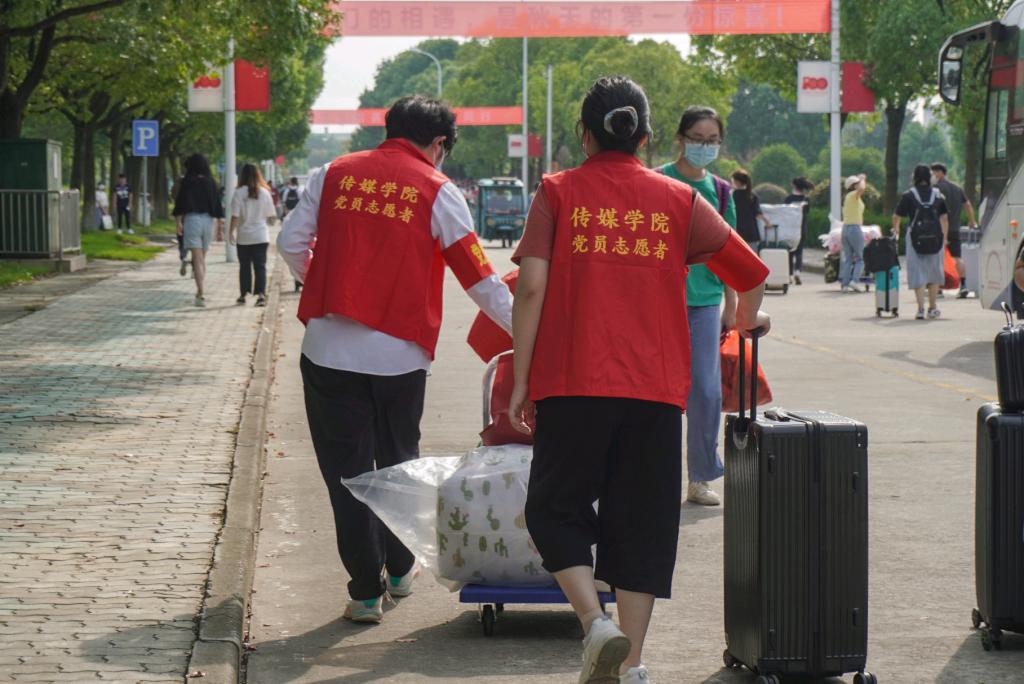 9月15日,beat365英国官网网站迎来了8000余名新生,来自传媒学院的40余名党员组成迎新志愿服务队,他们佩戴党徽、身着红色马甲,积极走上迎新岗位,接过新生手中沉甸甸的行李箱,指引新生有序报到,穿梭在熙来攘往中,成为了一抹红色的校园风景线。