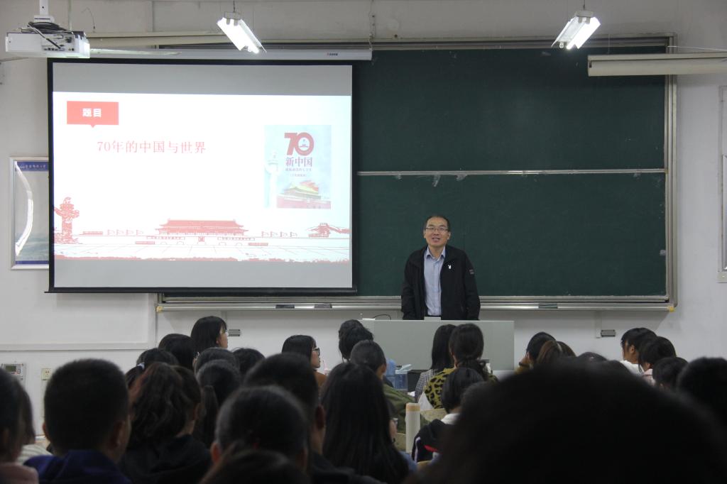 11月6日,马克思主义学院党总支举办形势政策教育暨党课专题报告,学院党总支书记金文斌作《70年的中国与世界》专题报告,学生党员、入党积极分子、发展对象和部分党员教师120余人参加了报告会。