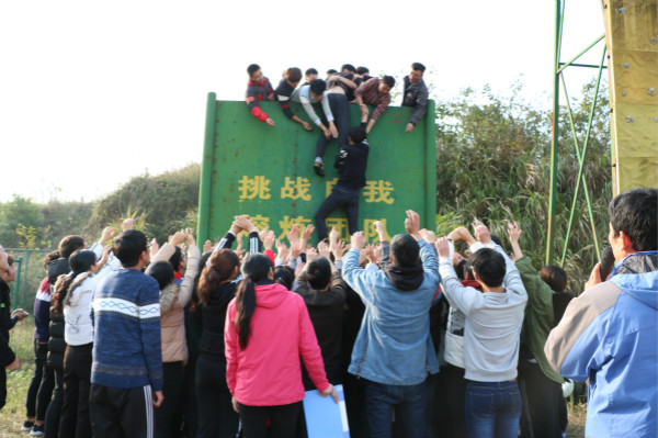 下午,学员们进行的最终挑战是毕业墙。面对高达4.2米的毕业墙,学员们没有迟疑,商量好对策之后,大家立刻行动起来,搭基座、伸手靠前保护、运人、换基座、下来再运人,上去的人越来越多。随着培训师哨音落下,学员们最终以30分42秒的成绩完成挑战。“有些困难,咬一咬牙,队友就上去了。” 一名一直充当底座的学员说道。经过了一天的拓展活动,学员孙小桐说:“今天拓展一行,获益良多,很享受这种团队协作,互相信任一起完成一个目标的过程。”