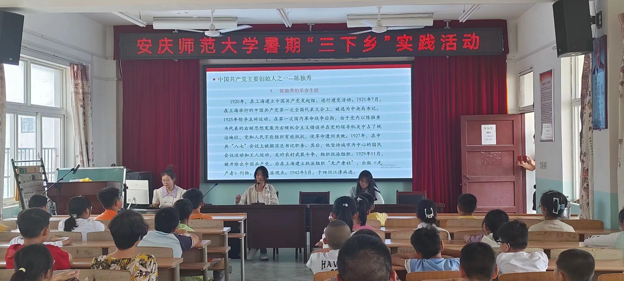 除了陈独秀父子的革命事迹介绍,宣讲队成员还播放了黄梅戏《江姐看长江》选段,为他们介绍了《红岩》的故事背景和剧情梗概,讲述了《新青年》的历史意义,与学生们共同朗读了鲁迅先生的《随感录十四》,带领同学们一起回望了那一段艰苦的革命岁月。