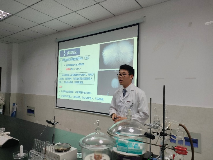 首先是讲解展示环节,趣味化学科普浩然工作室负责人,2019级化学(1)班李浩然向同学们展示了实验内容:烧杯中上一秒还在发热的“神奇”溶液,在倒下的瞬间竟慢慢凝固,赢来了在场同学的阵阵掌声。李浩然借助着多媒体设备,展现了这一神奇过程的宏观和微观角度的变化,并有条不紊地解释了实验原理——醋酸钠溶液的稳定结构遭到破坏,过多的溶质像水结冰一样迅速结晶,同时会放出热量。