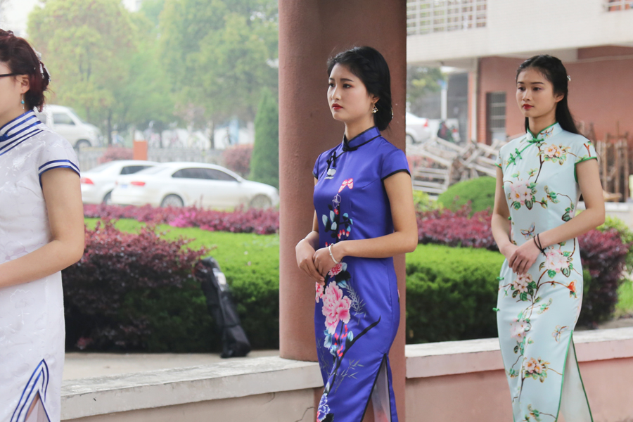 “素胚勾勒出青花笔锋浓转谈,瓶身描绘的牡丹一如你初妆……”伴着一曲中国风的《青花瓷》,8位旗袍女子分成两组,沿着艺术楼中央的长廊款款走来。她们或手执团扇,或撑一把油纸伞,姿态优雅,步伐缓慢轻盈,向观众展示古典和淡雅两种风格的旗袍。
