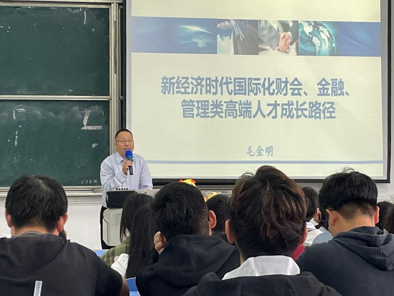 毛金明以“新经济时代国际化金融人士成才路径”为主题,就当前时代背景下学习就业的新格局,结合自身经验和切实事例,给同学们带来了一场精彩的报告会。他通过对大学期间个人规划方面成功与失败的案例分析,讲述同级同学不同成才之路的故事,告诉同学们要学会制定科学合理的专业学习规划。他指出,经管类大学生要具备国际视野,依照“行业价值链”的原则,参加实践学习,为将来能够进入财会、金融、管理等行业工作打下基础。