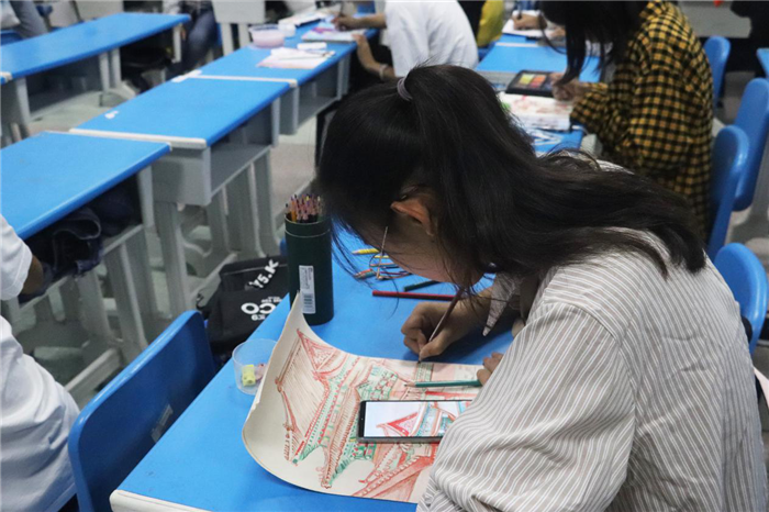 “这画得也太精细了吧!你看这树叶都清晰可见。”在场的工作人员纷纷感叹到。“我从小就喜欢画画,但是之前都是自学。高考之后,我才跟专业的老师学过四十天的素描。”物理学专业2019(2)班的石语杭介绍到,《天涯》这幅作品是他的第三幅风景画。画面中除了“天空”部分是临摹的以外,其他部分都是他现场设计出来的。