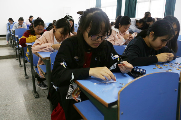 蝴蝶、梅花、游鱼、羽扇……为了方便社员们随时取用,各色各样不同形状的发簪零部件被整齐地摆放在桌子上。每一名社员都根据各自的想法制作着专属于自己的发簪。“我在高中时也做过不少的手工,绣过刺绣,也刻过橡皮章。但是做发簪却是生平第一次。”文化产业管理专业2018的张舒蓉表示,“我觉得做发簪更加需要耐心与细心,每个人的风格不同,做出来的东西也不一样。但是比起得到最终的成品,我更享受手工制作发簪的过程。”