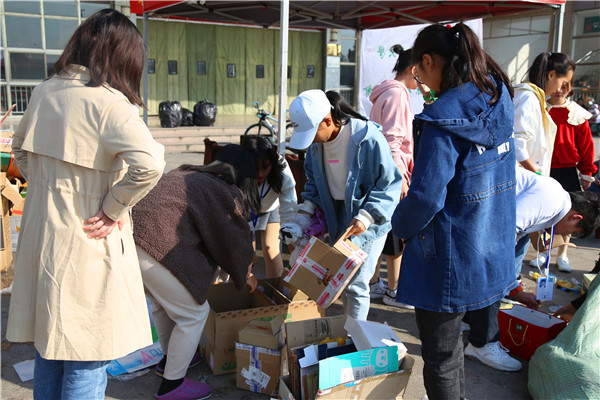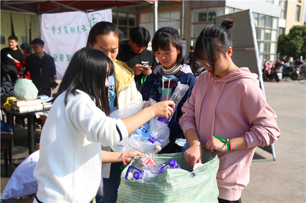 用自行车载着、和同学一起抬着、奋力地在地上拖着……11月23日上午,大学生绿源环保协会举办的“绿色银行”活动刚开始,市场营销2019级专业的同学们就陆陆续续以各种方式将积攒了许久的纸箱和塑料瓶运到了摆点处。一公斤纸盒可以换算成20个塑料瓶,经过统计,全班44位同学一共积攒了1886个瓶子。