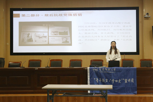 5月12日,音乐学院开展党史学习教育专题宣讲活动,校“青年新声 学‘四史’”宣讲团为音乐学院入党积极分子培训班学员做《烽火岁月,不屈战歌》主题宣讲报告,中国近现代史基本问题研究专业2019级研究生王利华与马克思主义中国化专业2020级研究生黄薛杰担任主讲人。