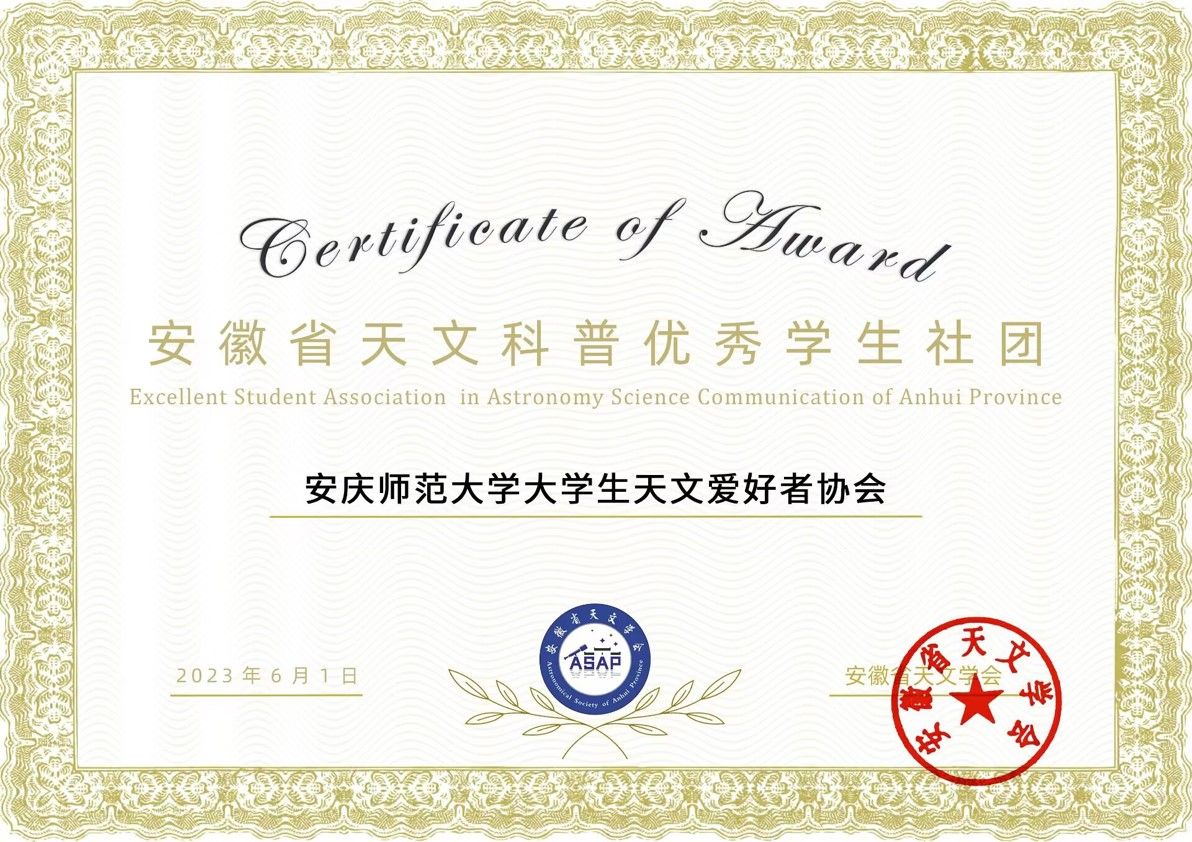 6月1日,beat365英国官网网站大学生天文爱好者协会荣获由安徽省天文学会颁发的“天文科普优秀学生社团”荣誉证书。安徽省天文学会秘书长、中国科学技术大学蔡一夫教授来校参观并调研天文爱好者协会建设和科普活动开展情况,对协会工作表示肯定。