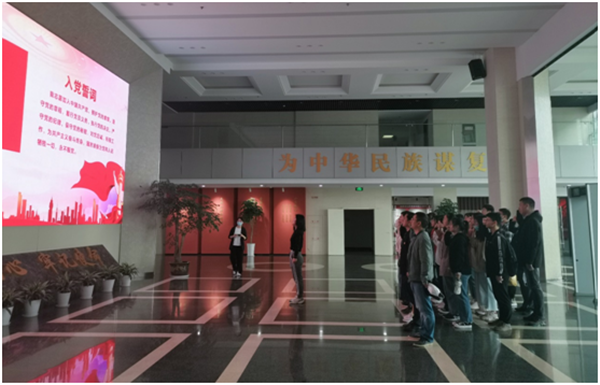 在党建馆序厅里,全体师生党员戴党徽、正衣冠、整齐列队,面对鲜艳的党旗高举右拳郑重宣誓,重温那段激动人心的入党誓言,共同铭记中国共产党100年的筚路蓝缕、风雨兼程。用这种庄严的方式,铭记初心使命,为党的生日祝福,并凝聚前行的无穷动力,砥砺奋进新时代的伟大征程。