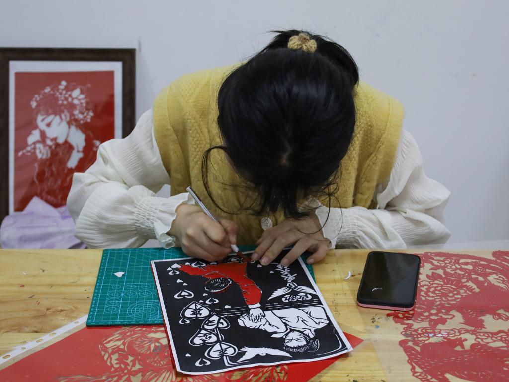 目光专注,不时变换刻刀角度、转动纸张,手起刀落,法学专业2021(3)班于梦涵的作品已然成型。“我剪的内容与抗疫相关,剪纸能够表达美好祝愿,希望疫情能够早日结束,人们能够尽快回归正常生活。”她介绍,自己对剪纸非常感兴趣,高中时期曾学习过两年剪纸,听说美术学院举办体验活动,自己就参加了。