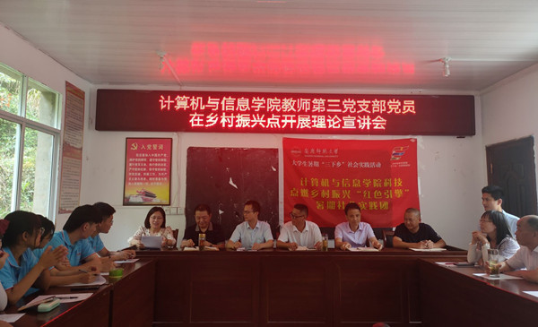 7月12日,计算机与信息学院教师第三党支部党员江晋剑等前往学校乡村振兴帮扶点开展党史理论宣讲活动,支部党员作了题为《近代中华民族的历史任务和辛亥革命》的党史理论宣讲,学校乡村振兴帮扶点西冲村党支部书记朱先如、村两委成员、党员群众代表及暑期社会实践大学生参加了宣讲会,会议由江晋剑主持。