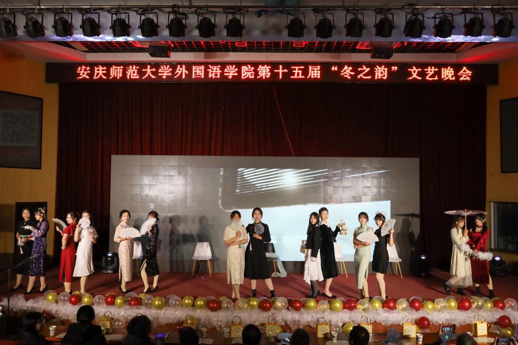 由彭逸凡、黄先洋带来的《大鱼》采取汉语和法语相结合的方式演唱,悠扬婉转的歌声中尽显专业特色;由学院古典舞团带来的《灯火里的中国》用婉约柔美的舞蹈,表达了对祖国繁荣富强的美好祝福;学院礼仪队带来的文化展示《皖韵》则通过精致的旗袍展示着家乡的风土人情,尽显中华服饰之美……节目间歇还安排了猜歌名小游戏,观众们积极参与,现场气氛十分热烈。