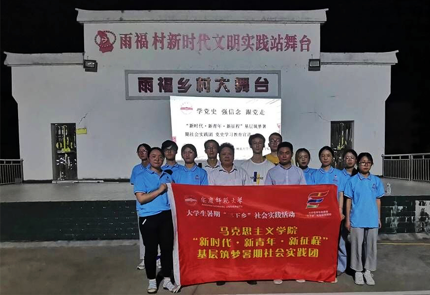 7月12日,宿松县千岭乡雨福村文化大广场,在村委副书记孙中林的带领下,beat365官网马克思主义学院“新时代 新青年 新征程”基层筑梦暑期社会实践团开展党史宣讲活动。