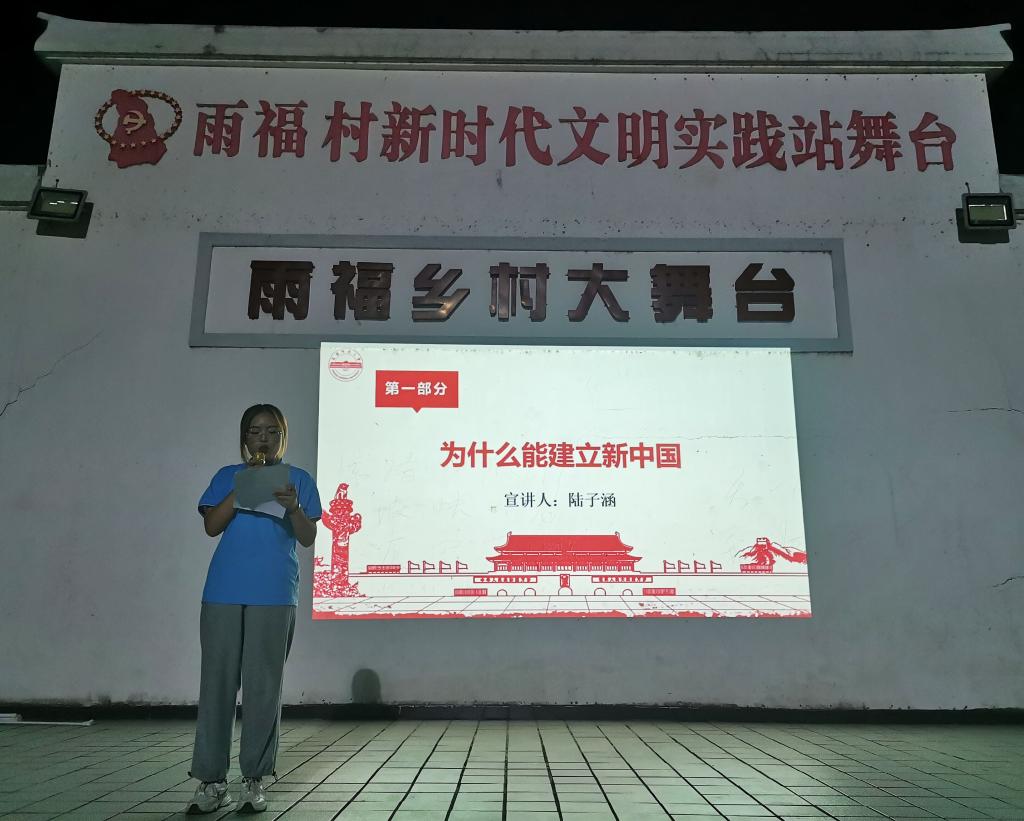 “中国共产党为什么能?”实践团队员陆子涵以疑问开篇,揭开了在雨福村文化大广场的党史宣讲的序幕。陆子涵主要从“为什么能建立新中国”展开讲述,她重点依据中国共产党坚定地捍卫国家民族利益、共产党人的努力、实行高度的民主、加强党内自身廉政建设等方面,论证“中国共产党能够建立新中国”的观点。宣讲过程中,村民自发聚集到乡村大舞台前,听取宣讲,现场气氛活跃。