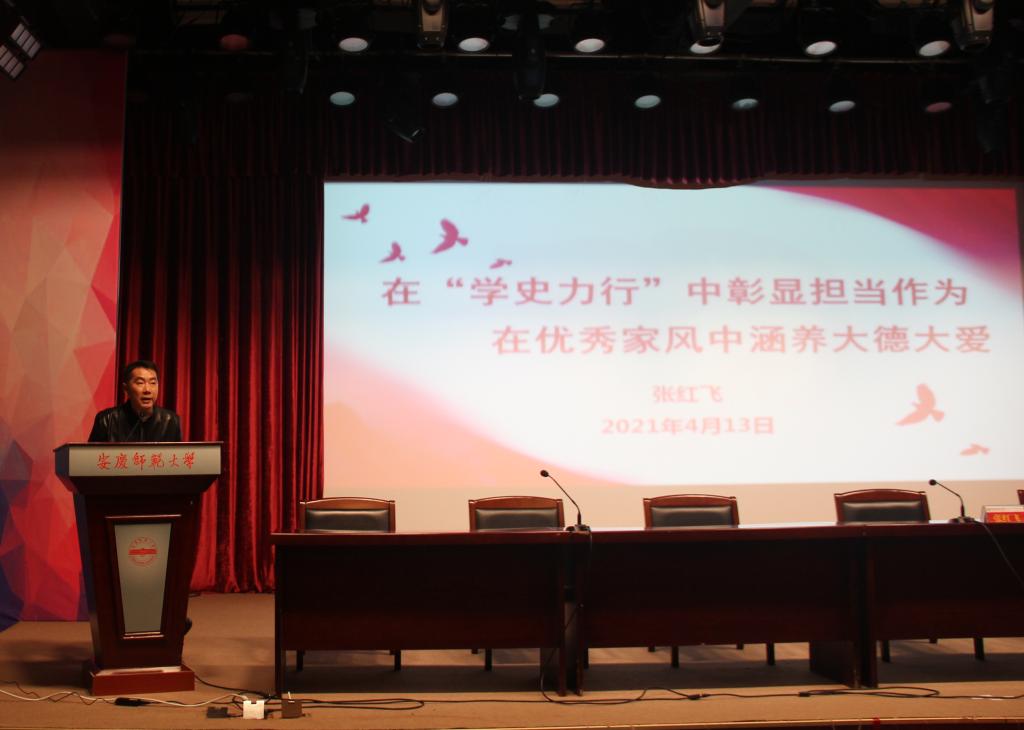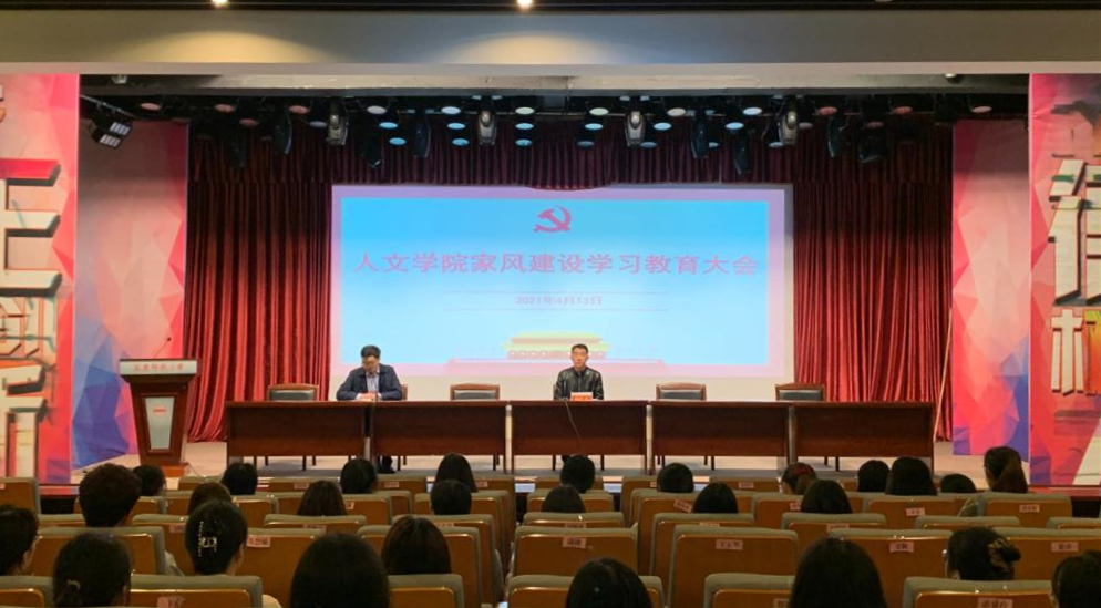 4月13日晚,人文学院在菱湖校区图书馆报告厅举办家风建设学习教育暨专题党课报告会。学院党委书记张红飞出席会议并作了题为“在‘学史力行’中彰显担当作为 在优秀家风中涵养大德大爱”的专题党课报告。全体学生党员参加会议,会议由党委副书记王波主持。