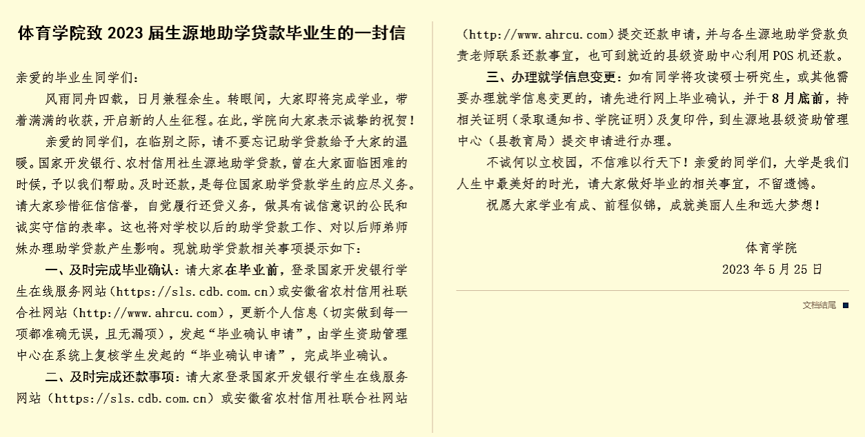 “奋斗是青春最亮丽的底色,行动是青年最有效的磨砺”。作为青年学生,应当有责任、有担当,用智慧和汗水共筑中国梦;作为家庭经济困难的学生,更应该明白,诚信乃立身之本,诚信还贷是对党和国家资助政策的回报,也是检验自身诚信为人的重要指标。为切实做好学院2023届贷款毕业生的贷后管理工作,帮助贷款学生树立诚信还贷意识,学院撰写并发布了《体育学院致2023 届生源地助学贷款毕业生的一封信》,就毕业确认、贷款还款和办理就学信息变更等事宜进行了详细介绍,将诚信教育贯穿于毕业生文明离校教育中,强化对诚信意识、法律意识和契约精神的宣传。