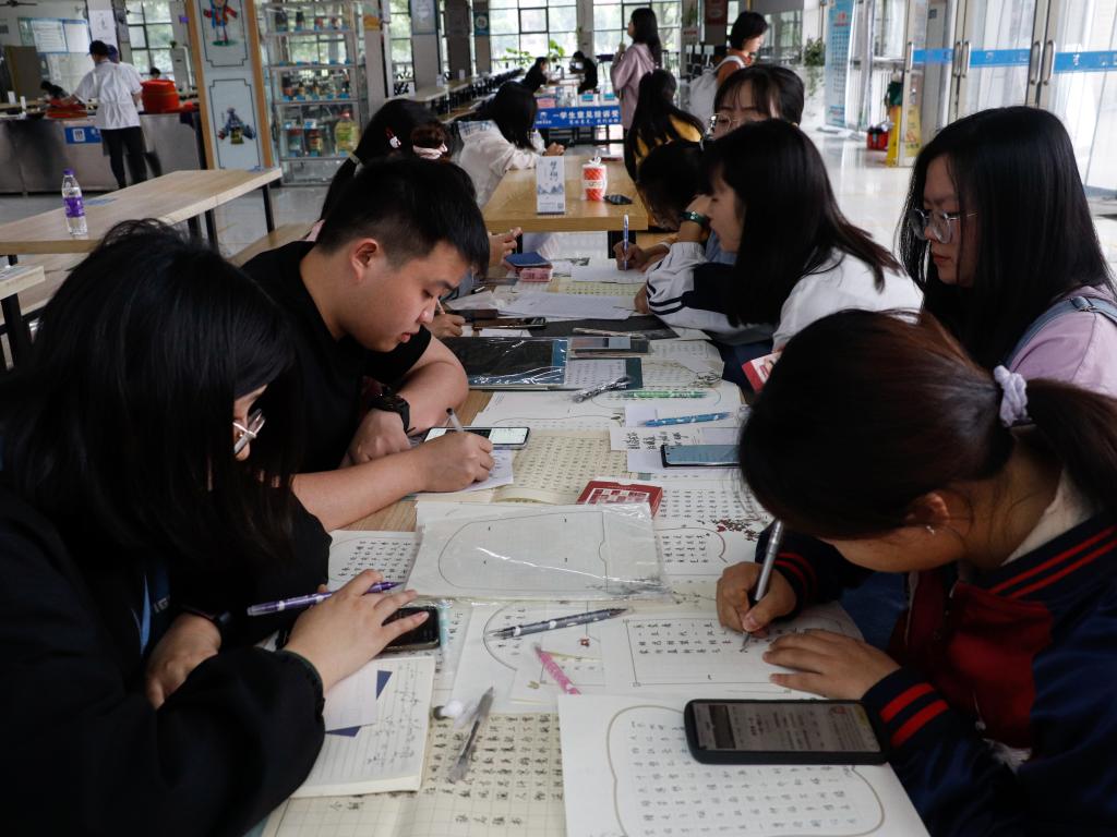 “这些书法作品真是太美啦!”5月15日,beat365官网硬笔书法俱乐部在西苑食堂一楼举办“书写五月”书法体验活动,150余名学生来到现场欣赏优秀作品,体验临摹的乐趣。