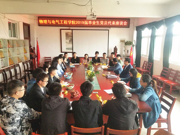 5月6日下午,物理与电气工程学院党委在学院会议室召开2019届毕业生党员代表座谈会。物理与电气工程学院党委书记江贵生、各学生党支部书记与毕业生党员代表共同座谈。座谈会由学院党委秘书主持。