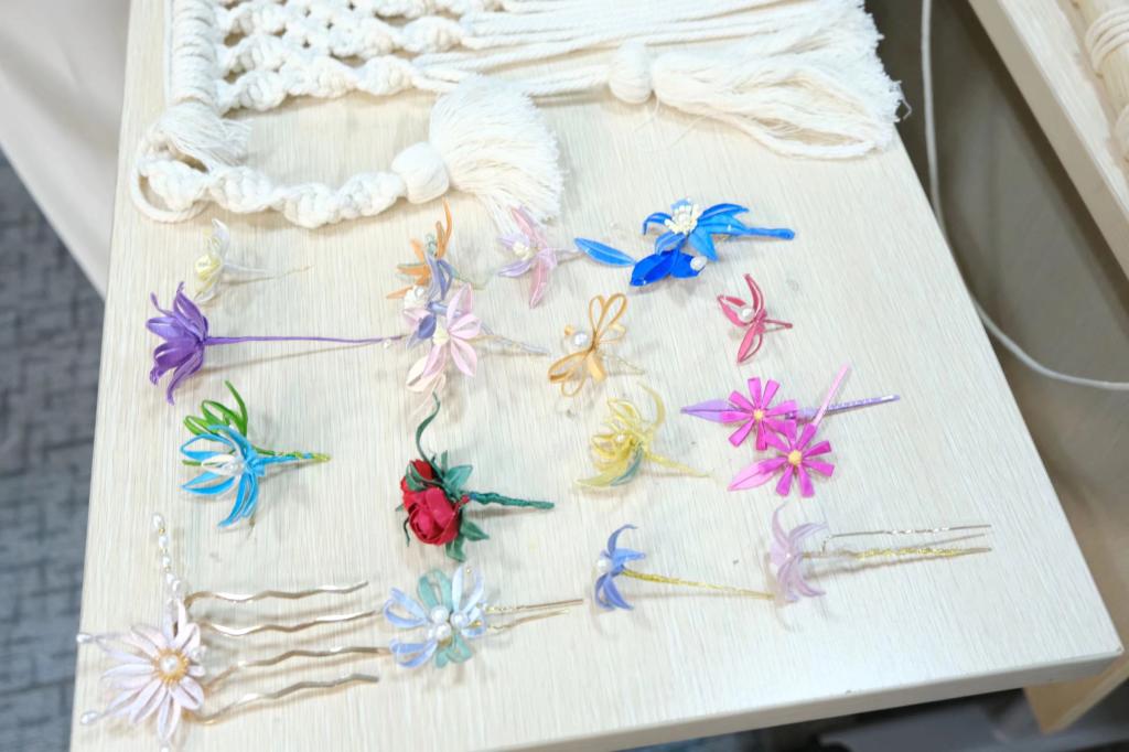 斜挎包、手提包、马鞍包、手工编织挂饰、荷花缠花、梅花缠花……每个班级的作品一一陈列展出,同时选出代表对作品进行介绍。对于学员介绍的作品,汤小曼逐一进行分析指导,“皮具颜色很好,但是形式过于单一,思想不够跳脱,款式方面可以有更多的创新。”