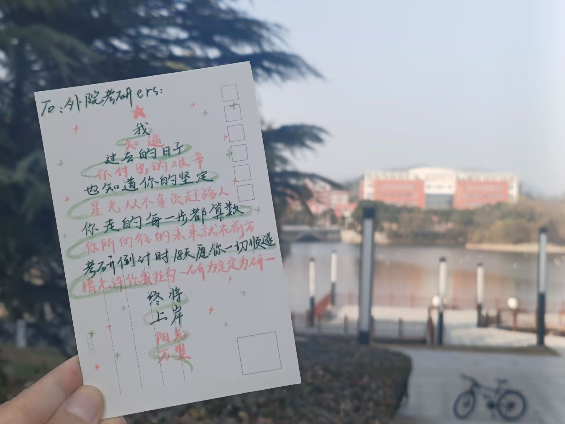 一声祝福,一份礼物,一句嘱托,温暖着考研学子的心,缓解了考前的压力,增强了考研必胜的信心。外国语学院一直高度重视毕业生考研工作,切实在思想、学习和生活等多方面为考研学子提供指导和帮助,助力学生成长成才。(撰写:宋晚月 李淼淼 摄影:廖晶晶 编辑:江伟 审核:何媛君 赵丽丽)