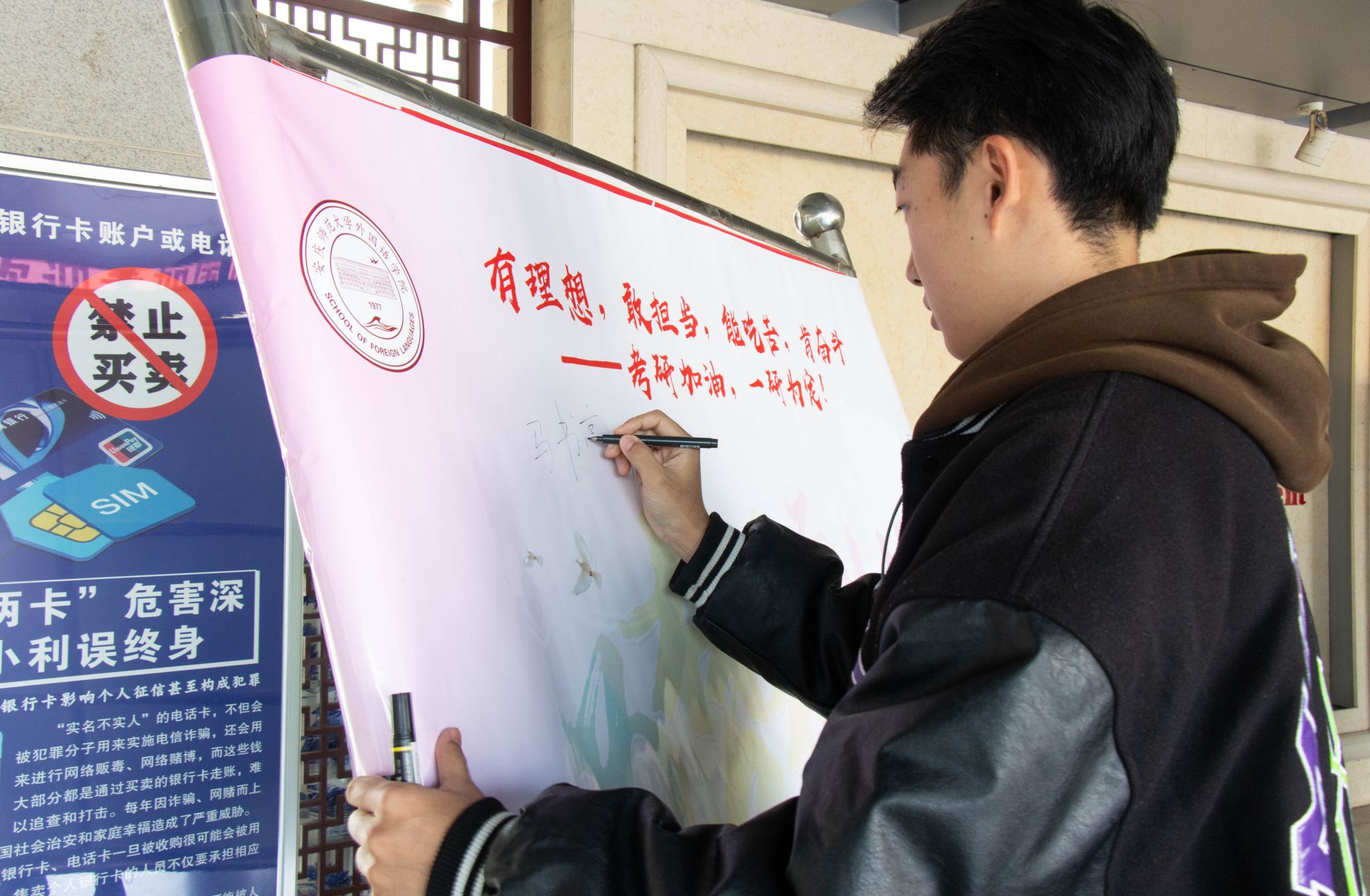 一笔一划,情系暖心加油墙。“我们终将上岸,阳光万里”、“一战成硕!”、“功不唐捐!”学院在一楼大厅设置了“暖心加油墙”,考研学子神情坚定,下笔有神,纷纷在加油墙上写下自己姓名及誓言。在紧张的备考阶段,这有利于帮助他们坚定目标、调整心态、自信面对考试。
