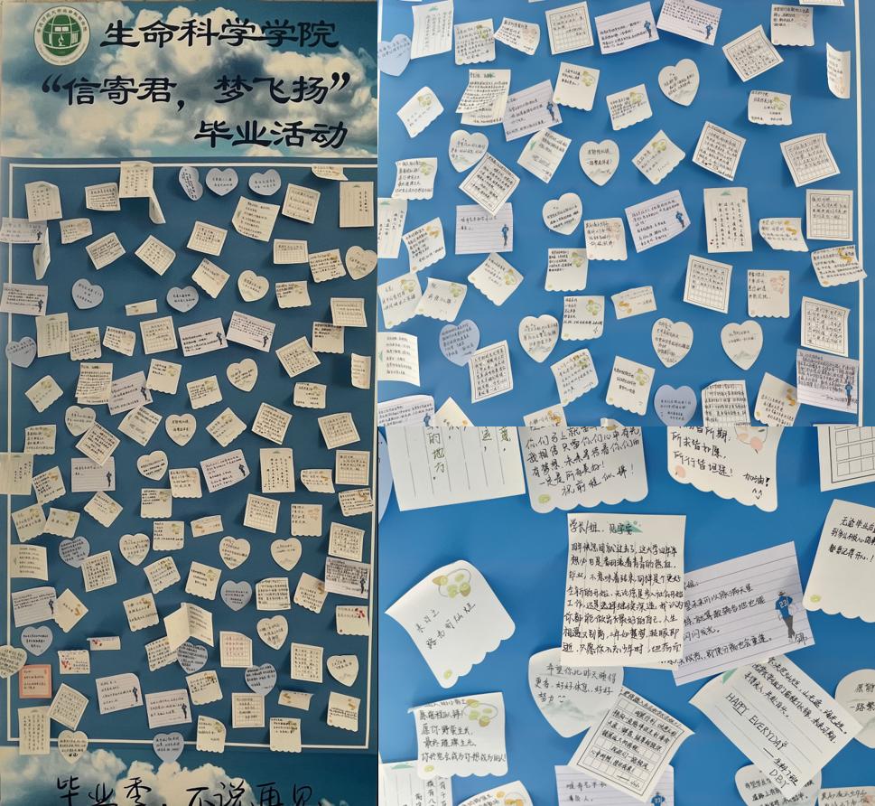 “试炼的终点是花开万里”“愿你们不彷徨不迷茫”“祝学长学姐们前程似锦,未来可期”……展牌上贴满了各式各样的便利贴。5月17日至22日,生命科学学院举办“信寄君,梦飞扬”活动。400余名学生为该院毕业生送上自己的暖心祝福。