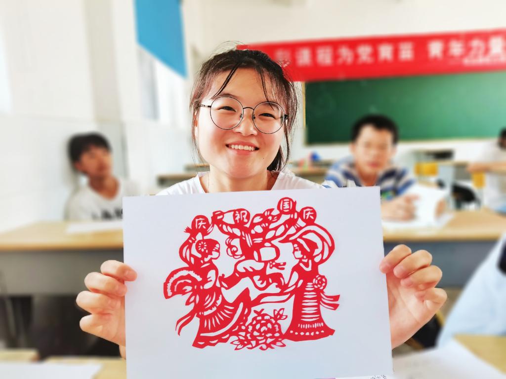 祖国山河为背景、“中国梦”字样显主题 、水立方建筑作点缀,这是学生檀佳怡选择的剪纸作品。檀佳怡表示,在剪纸图案刻画的过程中,她非常感动,脑海里浮现了无数为国家建设抛头颅、洒热血的革命先辈。“这盛世如您所愿!”她笑着说。