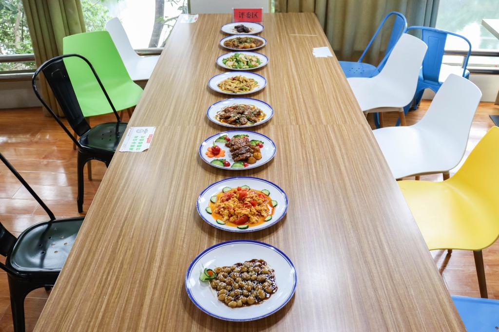 洗菜、剥蒜、削姜……参赛队伍在一小时内完成三道菜品烧制,评委根据菜肴的色、香、味、营养和创意进行评分。学生会主席团成员、音乐学专业2019(1)班的季玲玲表示,赛前学生会成员到达厨房对相关食材进行查看,部分没有采购到的食材由食堂工作人员提供。