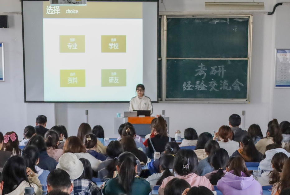 团委负责教师结合自己曾做考研辅导的经验,对当前考研形势进行分析。他强调,随着考研报考人数的增加,同学们要将适当观念报考学校,不要好高骛远过于追求名校,他还向大家分享了院校选择的方法。