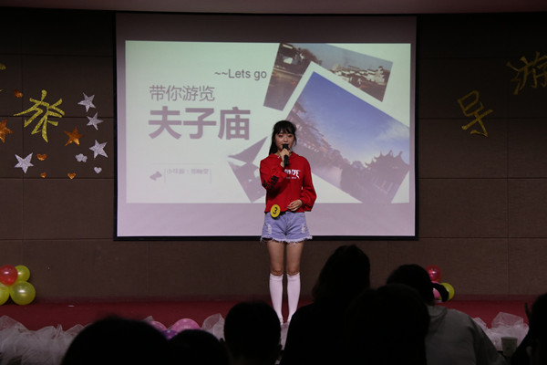 稻城亚丁、天柱山,或是最熟悉的安庆师大校园……各位选手通过生动的解说,在短短的两个小时里,让现场观众们领略到了不同地方的奇特美景。旅游管理专业2017(1)班的卜洋洋带团游玩的是天柱山旅游风景区。在正式的景区讲解前,她还细心地为游客们强调了登山的注意事项;地理科学专业2017(2)班的郑婉莹则带领游客们来到了南京的夫子庙,“不到夫子庙,枉来南京城”、“秦淮灯彩甲天下”……充满古风韵味的解说词让大家对这座古城期待不已。
