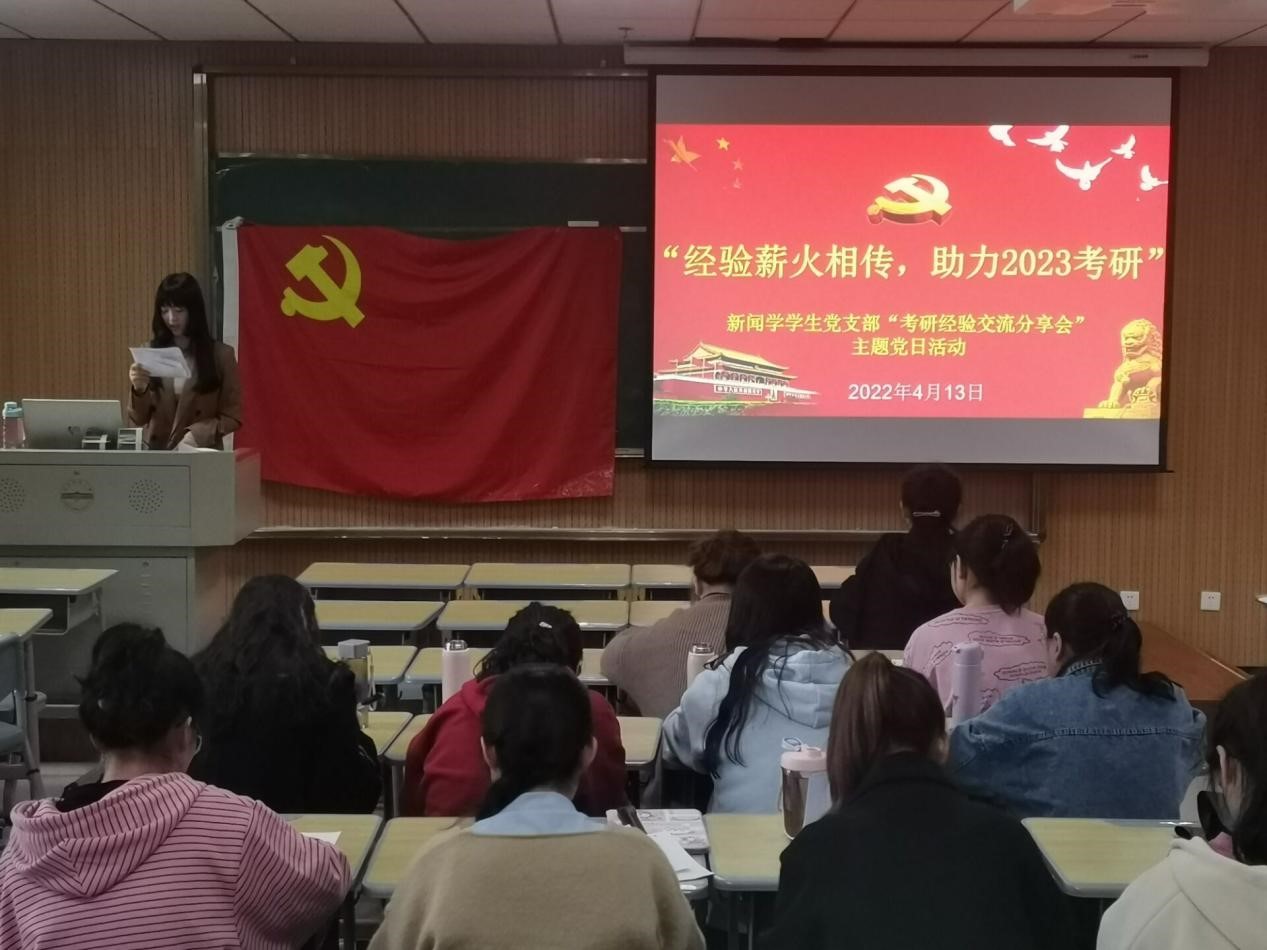 4月13日,传媒学院新闻学学生党支部开展题为“经验薪火相传,助力2023考研”的“考研经验分享会”主题党日活动。来自学院2020级、2021级研究生和2018级毕业生党员担任主讲人,为支部全体学生党员分享考研经验。会议由学院党委副书记、党支部书记张万茂主持。