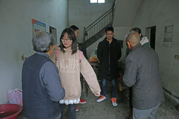 在斯方旺家中,思想政治专业2017级的马银等人拉着82岁的斯奶奶坐下来聊天,询问他们的生活状况,关心老人们的身体。看到地面上的杂物,学生们帮忙打扫起来。虽然学生听不懂当地方言,交流不畅,但学生们的真情实感却让这些贫困家庭感动着。