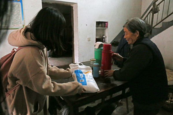 破旧的桌椅、满布油烟的灶台、一台老式电视,在这个家里,最值钱的恐怕就是一台冰箱了。当扶贫的学生带着米面水果等进到房间后,两个步履蹒跚的老人立刻迎了上来,在看到学生们送的东西后,户主斯方旺连连道谢。