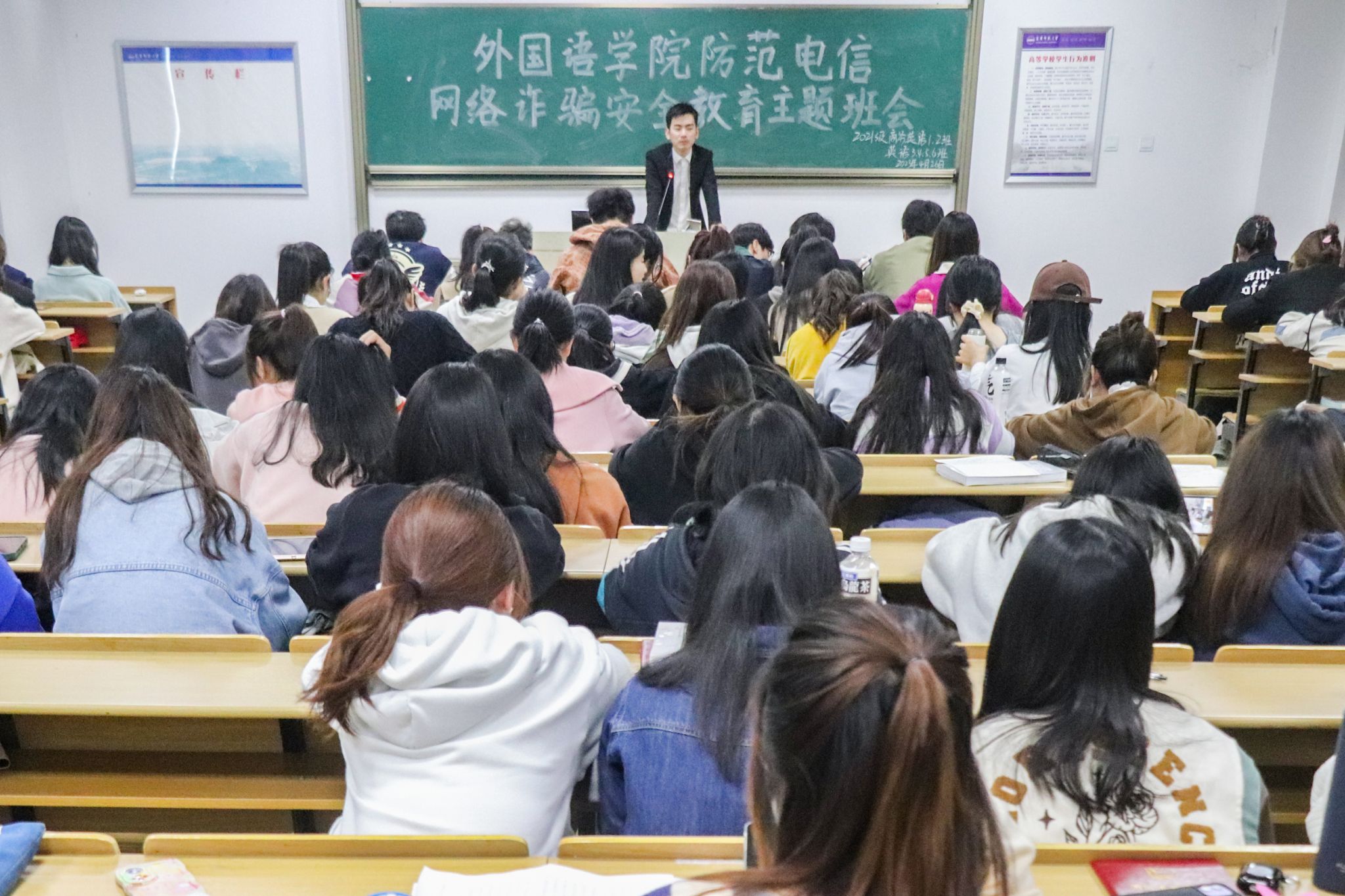 4月26日,外国语学院商务英语专业2021(1)班、商务英语专业2021(2)班以及英语专业2021(3)至(6)班在206教室开展联合班会。近200名学生成为班会“主讲人”,用多样化方式宣讲防范电信网络诈骗知识。