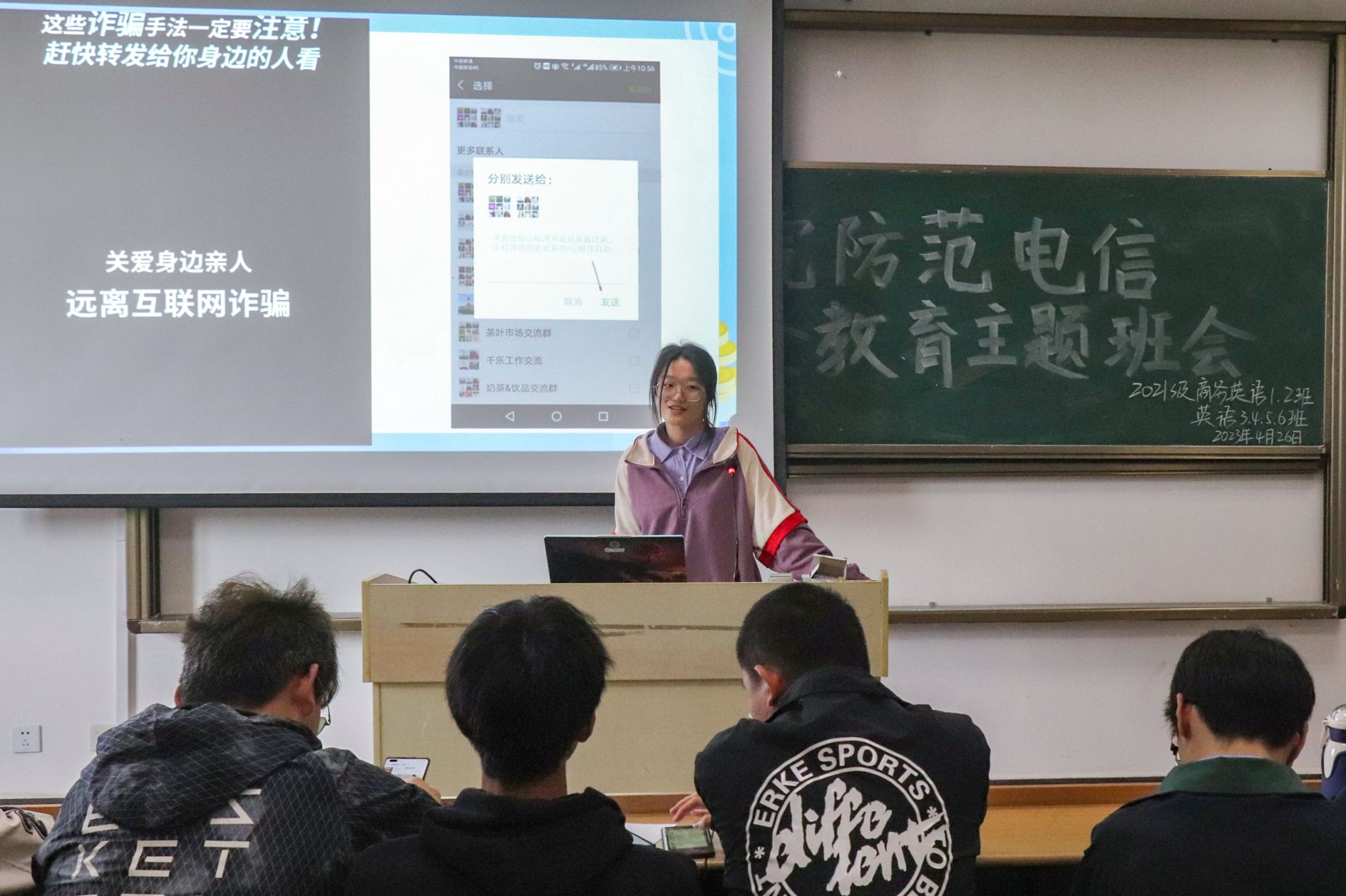 结合具体事例,商务英语专业2021(1)班以身边故事警示学生注意防范网络诈骗;利用谐音梗,英语专业2021(4)班用视频普及防诈骗小技巧;使用PPT,英语专业2021(5)班图文并茂宣讲防诈骗常识。